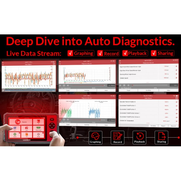 LAUNCH CRP919E podpira globok potop v samodejno diagnostiko z grafičnim prikazovanjem podatkov v živo, snemanjem, predvajanjem, skupno rabo